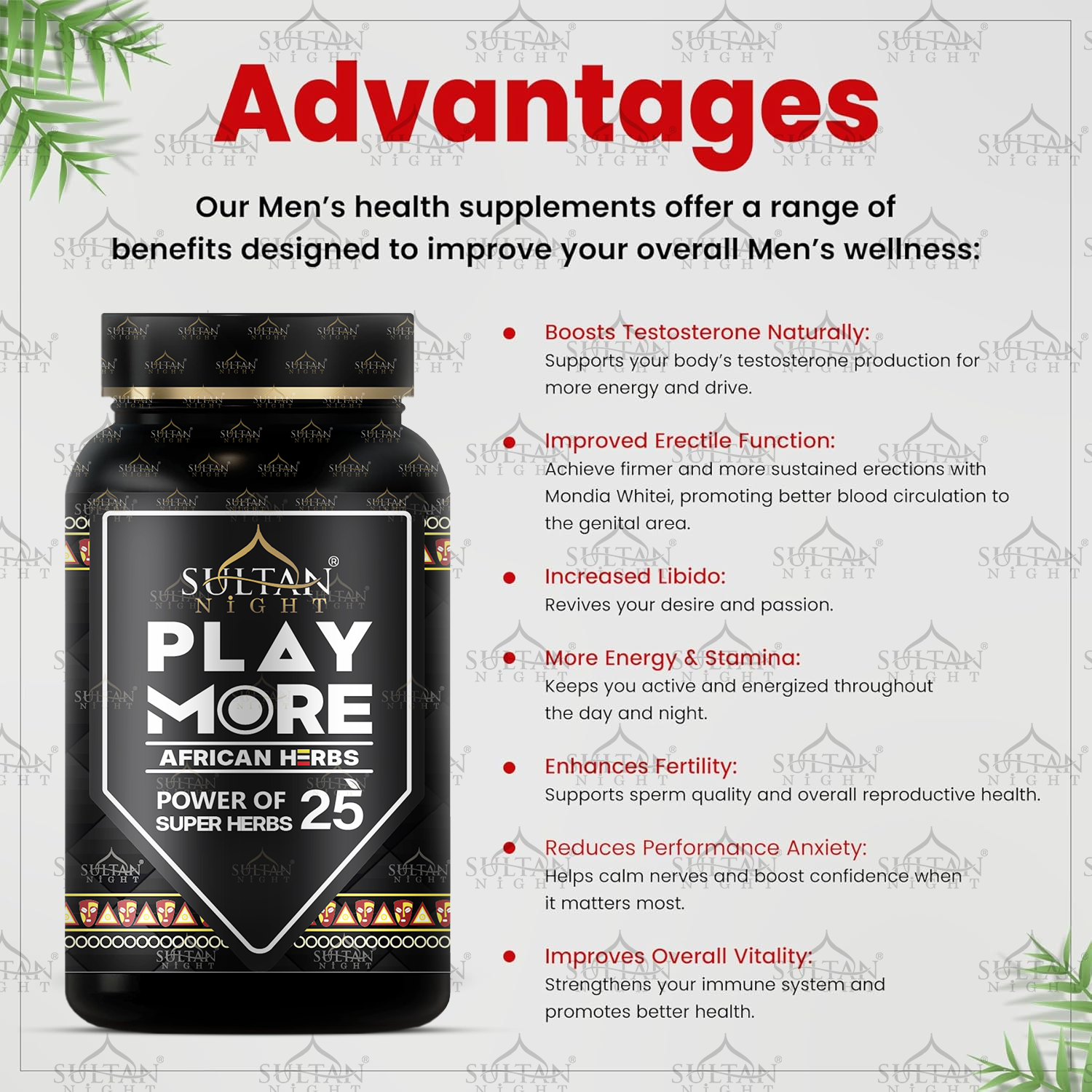 Combined with 25 herbs formulations, this play more powder works to enhance sexual performance. It provides a strong erection, prevents early ejaculation, and reduces testosterone levels. Include more play in your diet, it gives you complete satisfaction and makes your love life better than before.